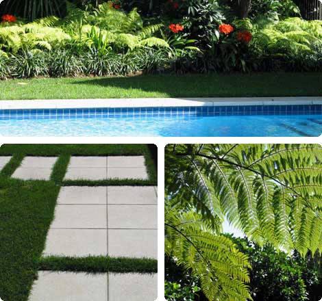 Simple paving slabs set flush with the lawn provide access from the main house to a sheltered paved spot for pool loungers outside the pool house.