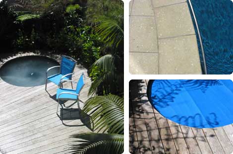 New stonework has reinvigorated a leaky stone waterfall at one end of the pool where new mature tree ferns underplanted with bromeliads create a shady glade.